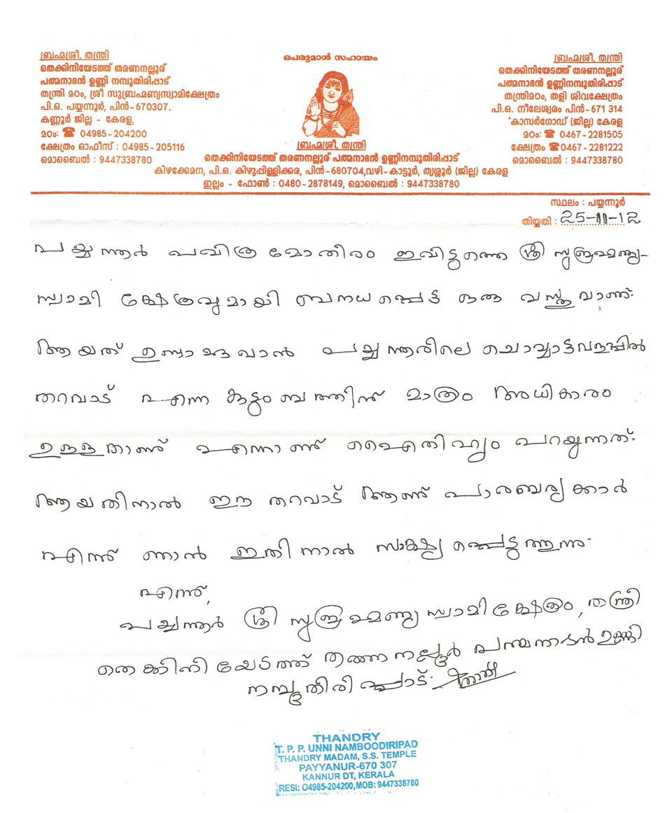 പയ്യന്നൂര് പവിത്ര മോതിരം പയ്യന്നൂര് സുബ്രഹ്മണ്യ സ്വാമി ക്ഷേത്രവുമായി ബന്ധപ്പെട്ട പുണ്യ വസ്തുവാണെന്ന് സാക്ഷ്യപ്പെടുത്താന് പയ്യന്നൂര് ശ്രീ സുബ്രഹ്മണ്യ സ്വാമി ക്ഷേത്രം തന്ത്രി തെക്കേനിയേടത്ത് തരണനെല്ലൂര് പത്മനാഭന് ഉണ്ണി നമ്പൂതിരിപ്പാടാണ് ഈ സര്ട്ടിഫിക്കറ്റ് നല്കിയത്. ഈ മോതിരം നിര്മ്മിക്കാന് മറ്റാരും ഓട്ടോറൈസ് ചെയ്തിട്ടില്ല.